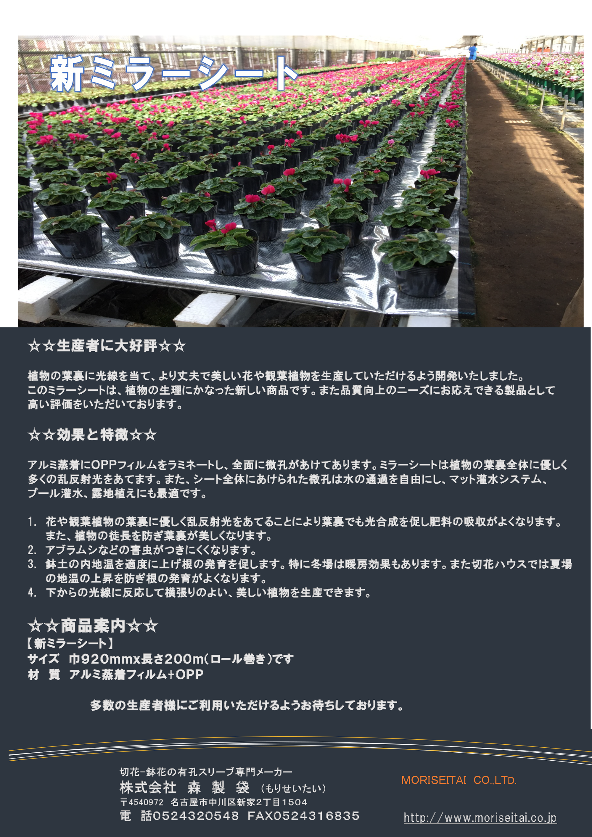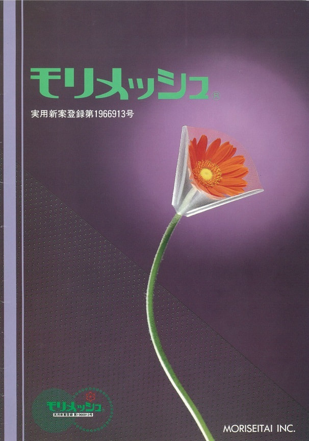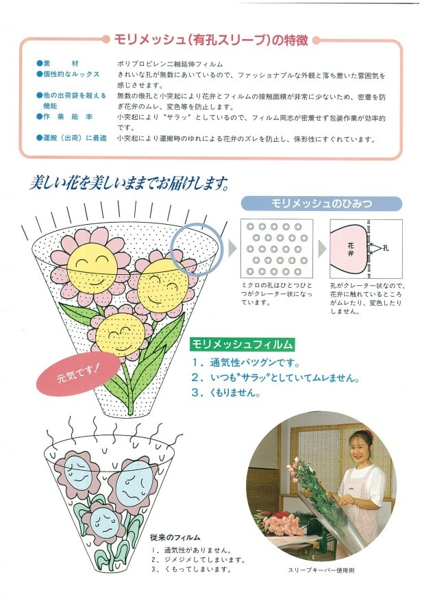 モリメッシュは生花用の通気包材です。ポリプロピレン製フィルムに独自の技術で孔を設け通気性を確保し生花の鮮度を保ちます。当初は切花の出荷用三角袋(保護フィルム)として開発されました。数々の改良を加え現在では鉢花出荷用三角袋、切花店頭用花袋など生花全般に保護フィルムとして幅広く使用されています。